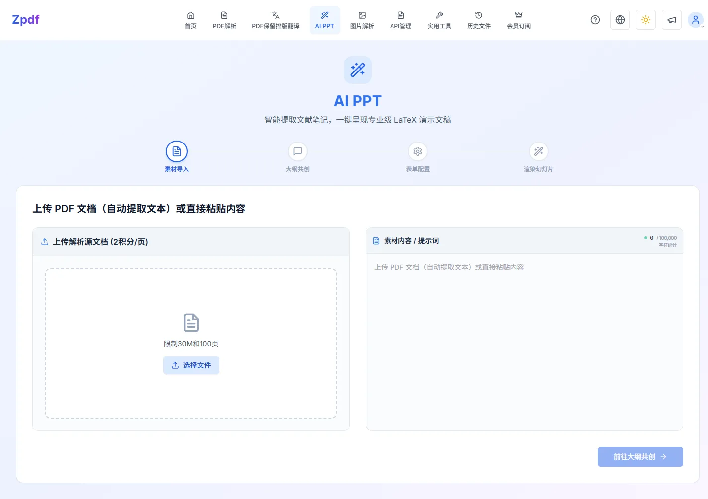 上传 PDF:在左侧「上传解析源文档 (2积分/页)」区域点「选择文件」上传 PDF。系统会先解析 PDF 并把正文填入右侧素材框,再自动进入大纲共创。上传即开始扣解析积分。