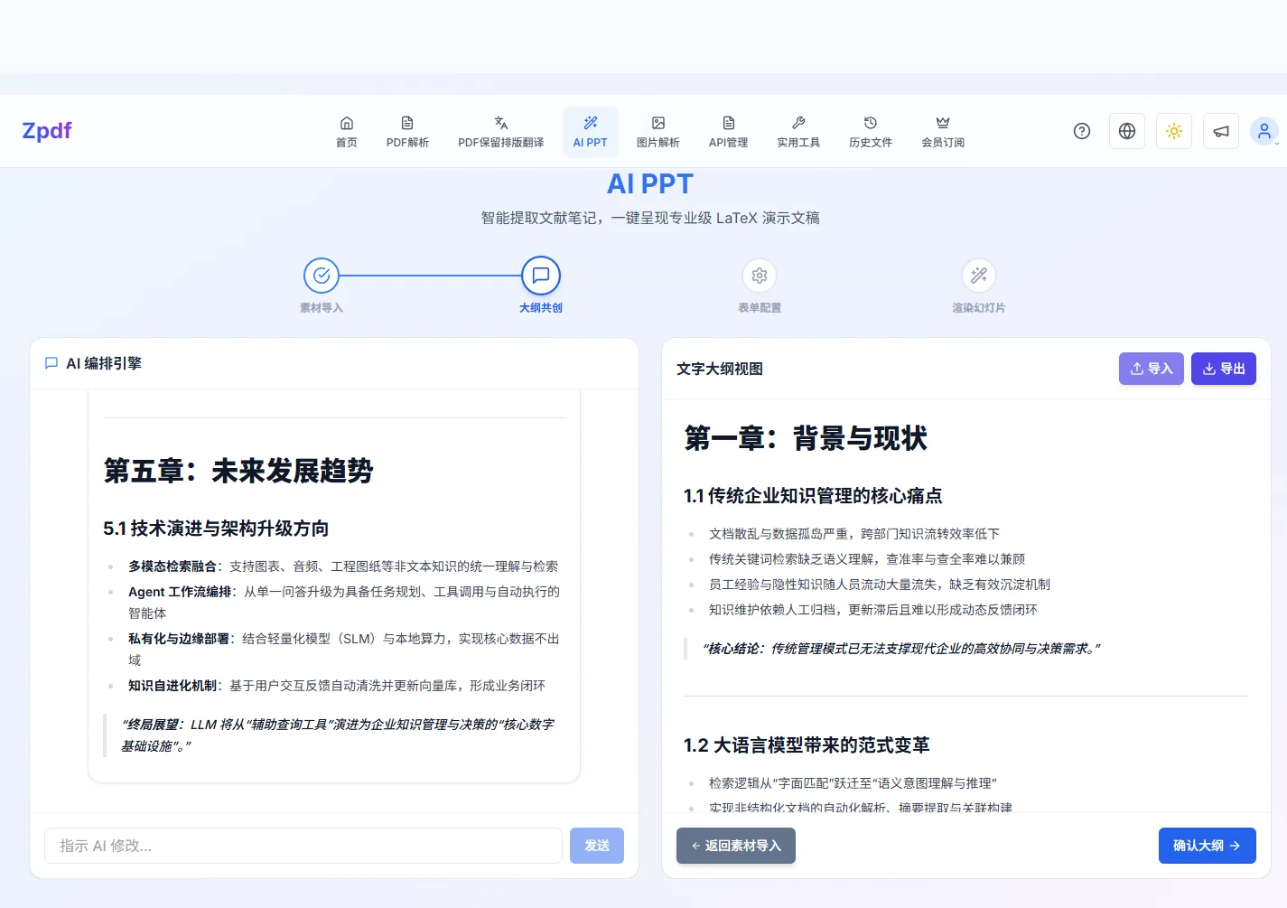 把你的素材或提纲生成为专业演示文稿,最终输出 PPT 样式的 PDF。整个流程分四步:素材导入 → 大纲共创 → 表单配置 → 渲染幻灯片,页面顶部的步骤条会高亮当前所处阶段。