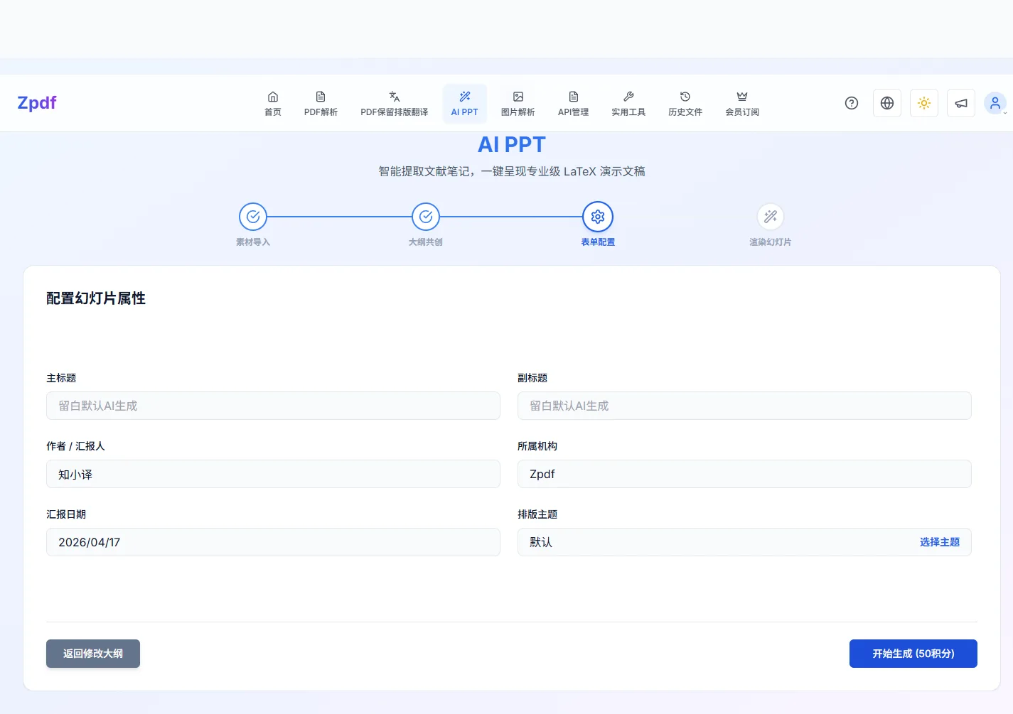 计费:50 积分/次,在第三步点「开始生成」时立即扣费。前两步的 AI 构思和确认大纲不计费。如果第一步走的是 PDF 上传路径,还要另加 2 积分/页的解析费用。