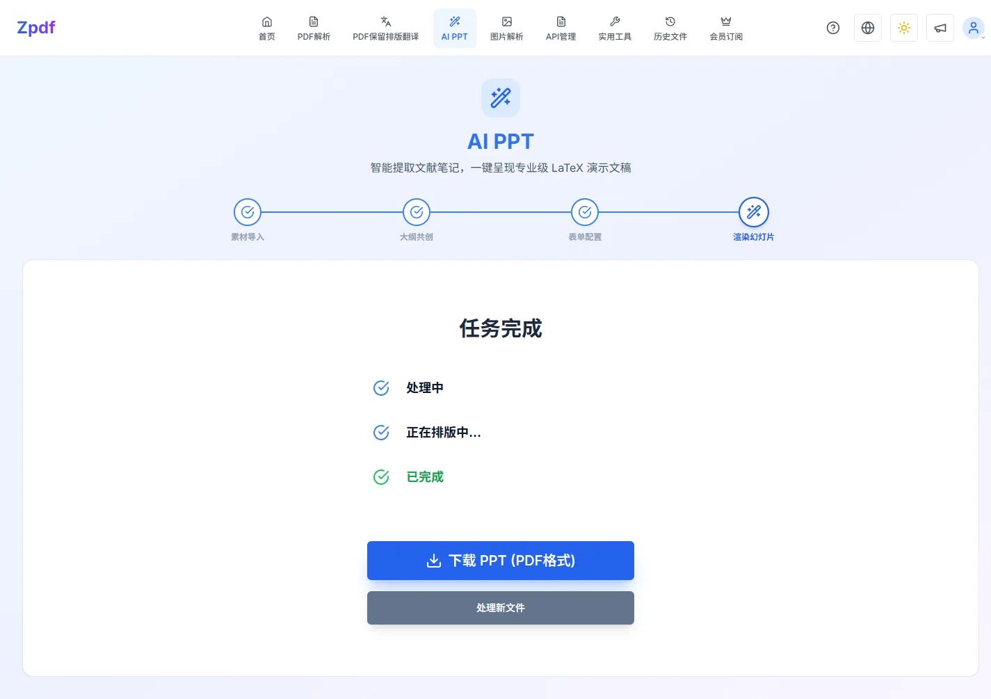 完成后会出现「下载 PPT (PDF格式)」按钮,点击下载结果 PDF;「处理新文件」则清空当前任务重新开始。若渲染过程中出错会显示「生成失败」并提供「返回配置页」按钮,已扣的积分不会自动返还,请先联系客服再重试。