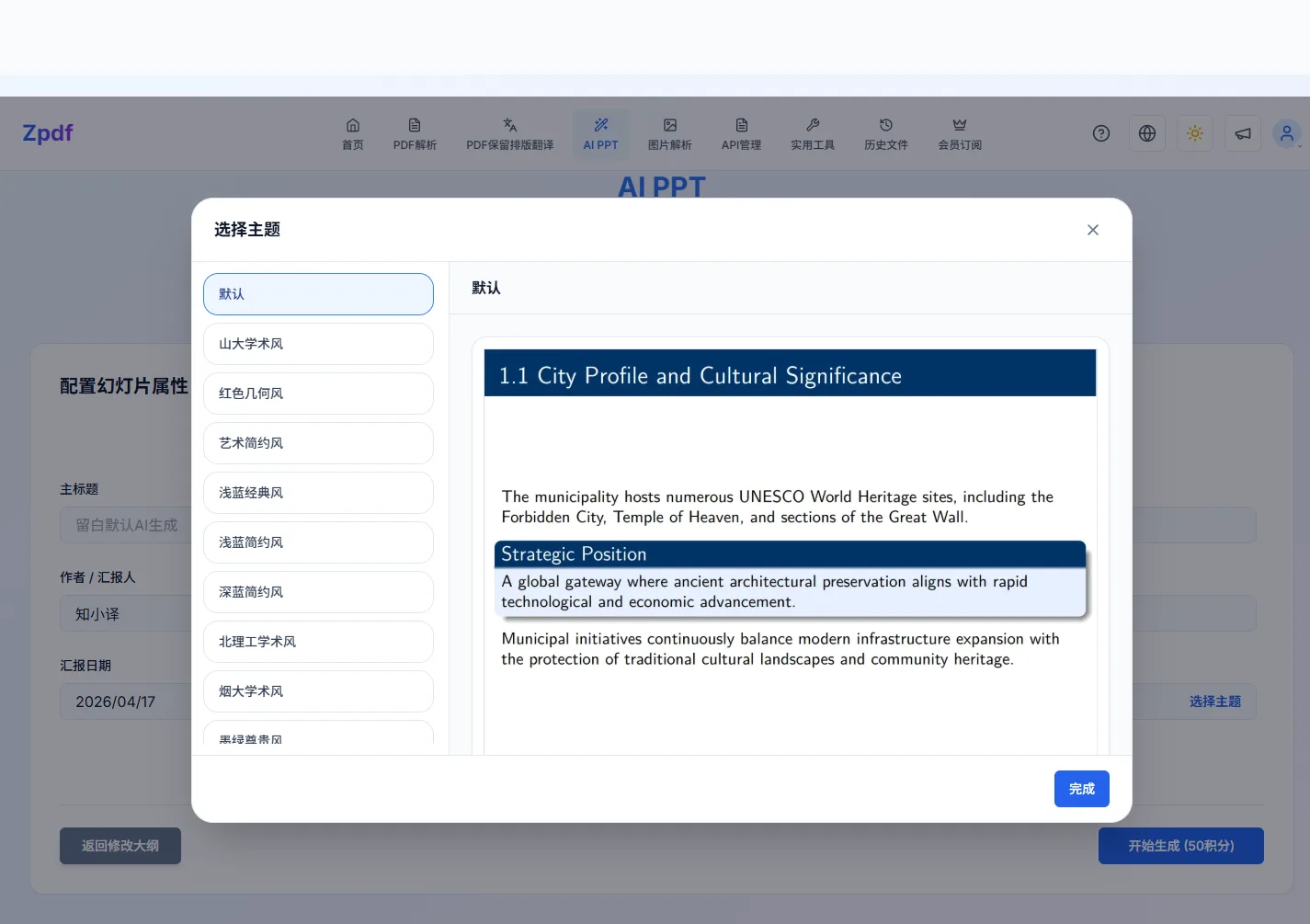 排版主题:点右下角「选择主题」弹出主题库,目前内置 12 套风格(默认、山大学术风、红色几何风、艺术简约风、浅蓝经典风、浅蓝简约风、深蓝简约风、北理工学术风、烟大学术风、墨绿尊贵风、灰白经典风、灰白简约风),左侧列表点选后右侧会出示样张预览,确认后点「完成」。