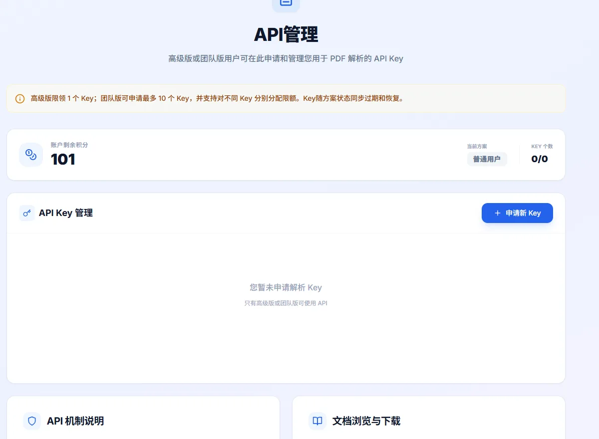 在 API 管理页点「申请新 Key」,生成后在列表中查看和复制。接口文档支持在线阅读,也可以下载 Markdown 版本。