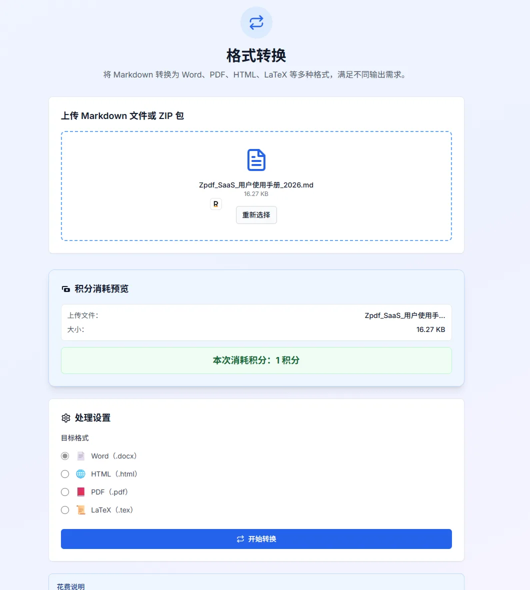 上传 .md 文件(如果 Markdown 里引用了本地图片,打包成 .zip 一起上传),确认积分预览,在「目标格式」里四选一,点「开始转换」。