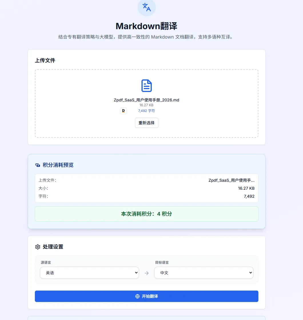 上传 .md 文件后,先确认文件卡片显示的是目标文件,再看「积分消耗预览」(以这个数字为准,不以标价为准)。确认没问题后,在源语言和目标语言下拉框选好语言,点「开始翻译」。传错文件点「重新选择」重传。