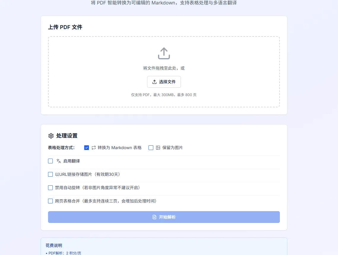 计费:1 积分/次,会员期内免费。限制:最大 300MB、800 页、10 个任务。