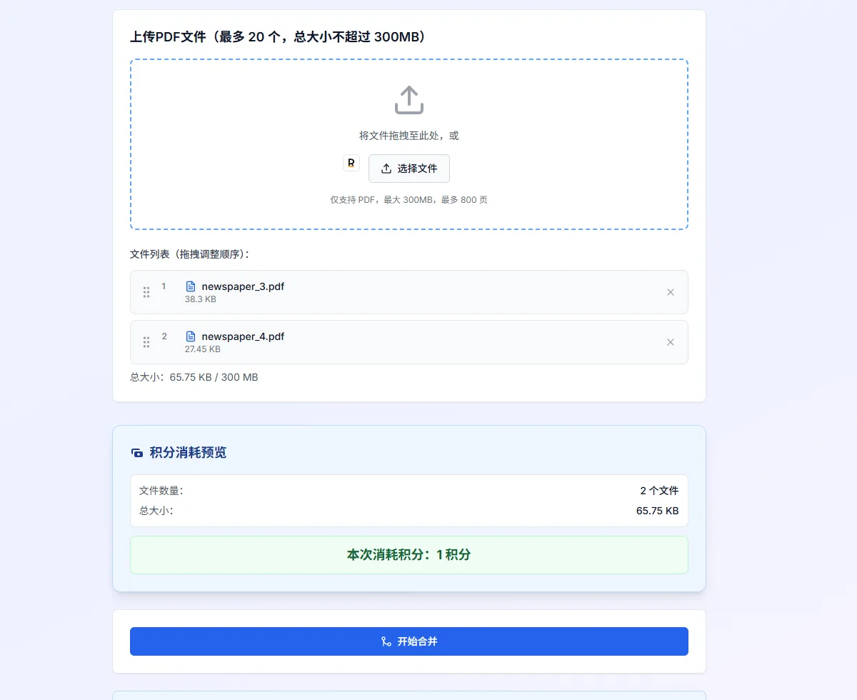 把所有要合并的 PDF 一次性上传进来,然后在「文件列表(拖拽调整顺序)」里把文件拖成你想要的先后顺序,这一步决定最终页面排列。多传了的文件点行末「×」移除。确认顺序和积分预览后,点「开始合并」。