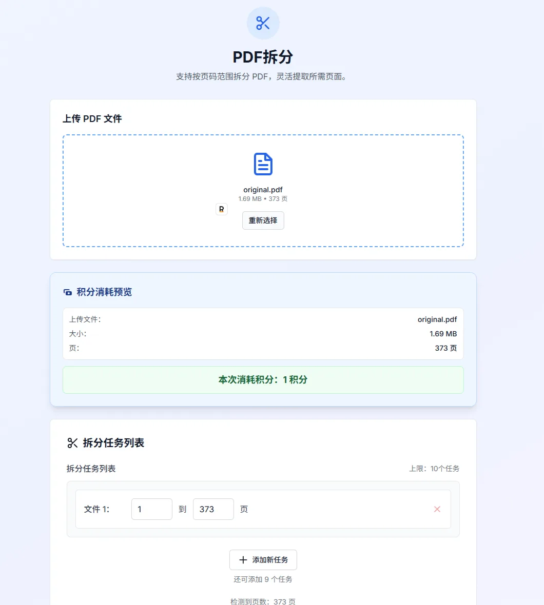 上传 PDF 后,系统自动读出总页数并创建第一个拆分任务。把起始页和结束页改成你要拆出的范围;需要拆多段就点「+ 添加新任务」逐条填入,最多 10 个任务。填好后点「开始拆分」。