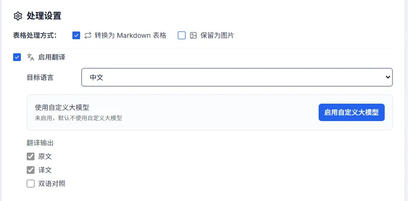 启用翻译:勾上「启用翻译」后,页面会展开目标语言、自定义模型和翻译输出三个额外设置。