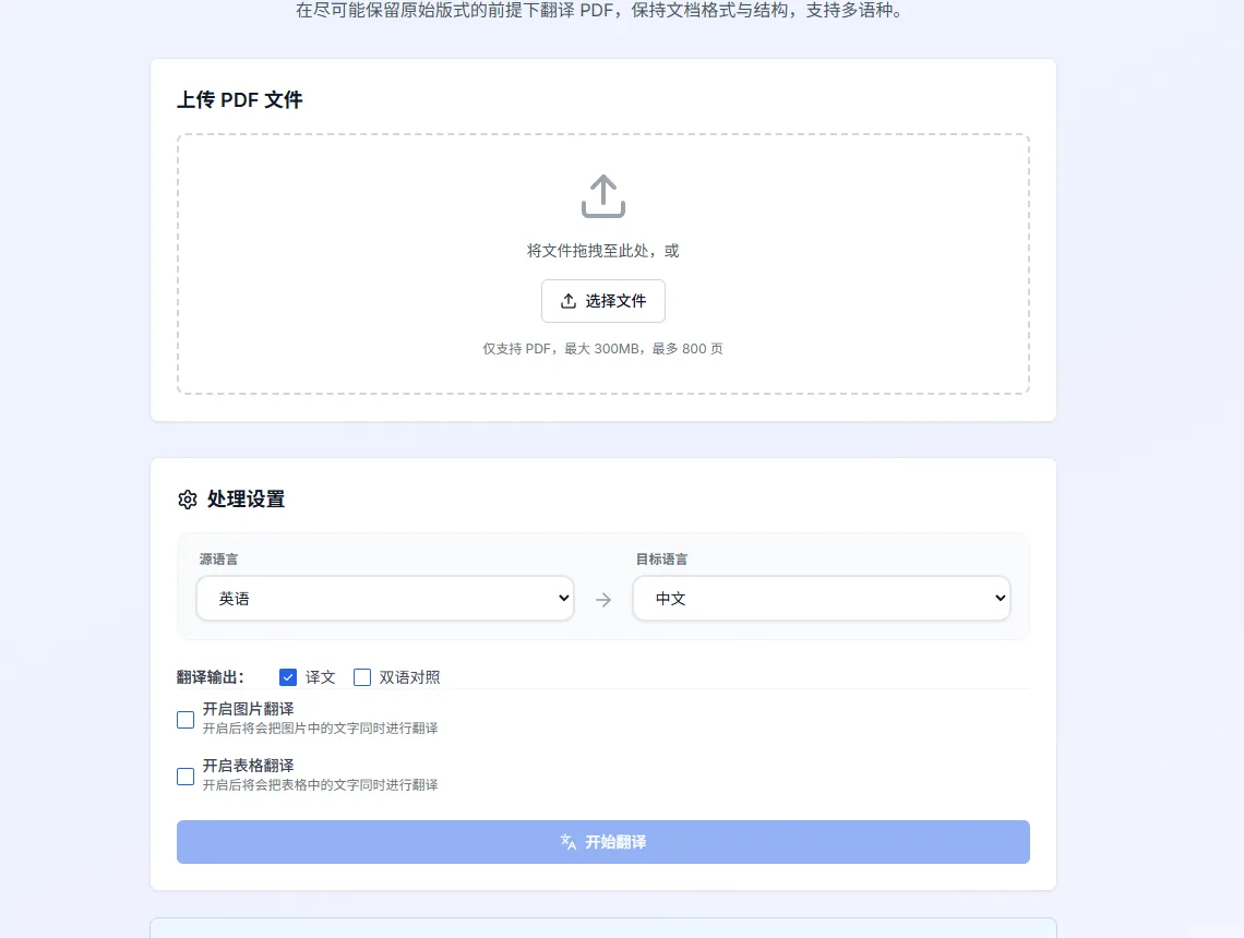 上传 PDF 后,在「源语言」选原文语言,「目标语言」选目标语言。「译文」默认已勾;如果需要同时输出一份双语对照版本,再勾上「双语对照」,两个可以同时勾选。双语对照版本的版式是每页左侧为原文、右侧为译文,适合对照阅读。如果图片和表格里也有文字需要翻译,分别开启「开启图片翻译」和「开启表格翻译」。设置完成后点「开始翻译」。